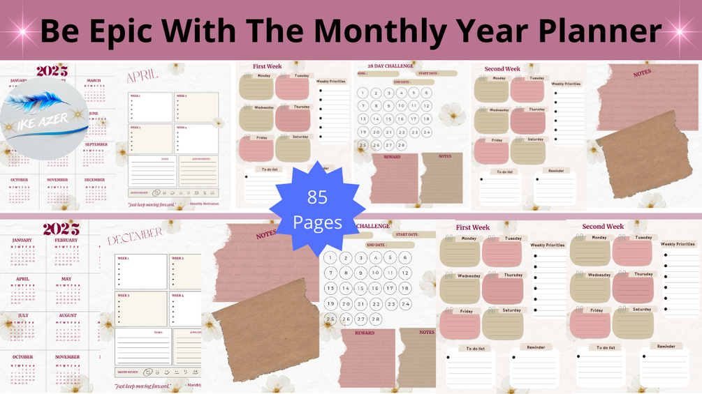 Make the most of your time and organization with the Digital Year Planner, the ideal tool to help you plan and achieve your yearly goals with precision and efficiency. This digital product features a comprehensive design that combines monthly and weekly planning with motivational challenges to help you achieve your maximum potential throughout the year.